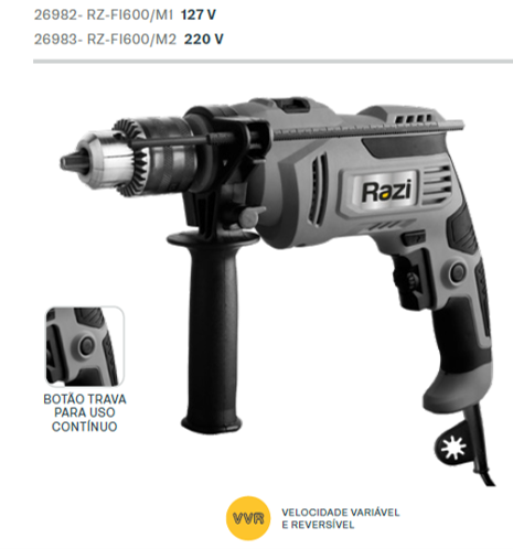 - Capacidade de furacão: ACO: 10mm – Concreto: 13mm – Madeira: 25mm