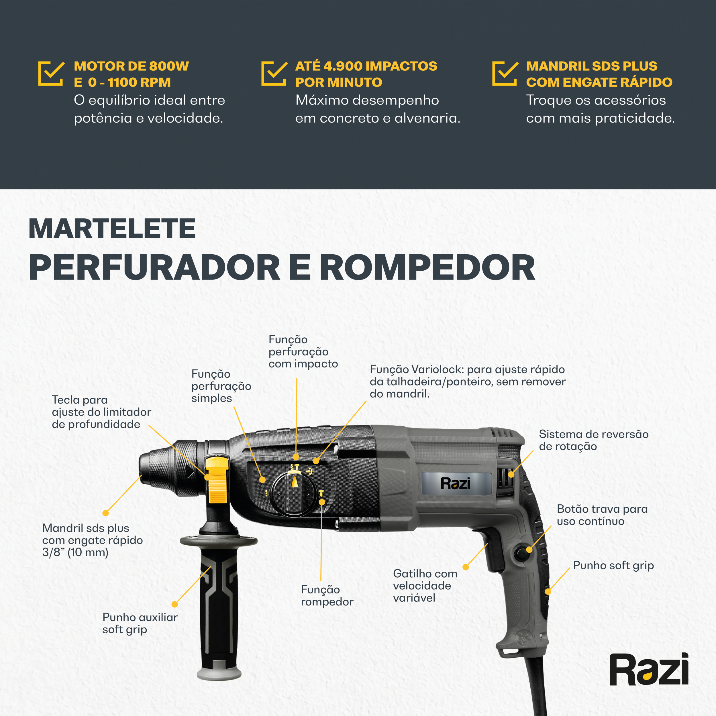 - Acompanha 3 brocas para concreto, talhadeira, ponteiro,